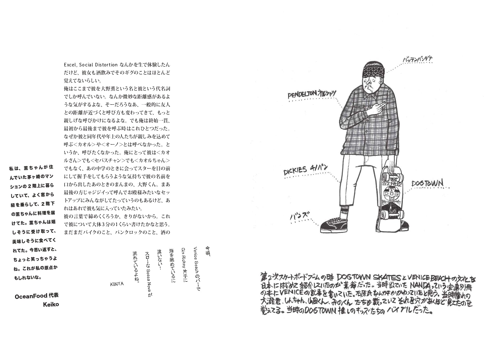ʼ70年代初頭〜ʼ90年代にかけて、時代の先を⾒据える鋭敏な感性と、天才的ともいえる⽂章⼒・表現⼒で、⼀つの時代を切り開いたサーフヒーロー。お洒落で、やんちゃで、それでいてナイーブで、⼥性にはめっぽう弱い。男⼥に関わらず誰にでも愛される、少年のような⼈だった。惜しむべきは傑出した才能を持ちながらも、誰もが知り得るような著名な功績を残してはいないことだろう。ただ、彼が残した無名の信条や世界観は、今でもサーファーの中に⽣き続けている。あるものは、スケートカルチャーの礎を築き、あるものはビデオグラファーとしてサーフムービーの新たな境地を開き、あるいは挫折し夢破れた⽣活の中、⽇々の⼩さなこだわりの中に⼤野薫が残したスタイルの⽋⽚は潜んでいるかもしれない。サーファーの間では、波の上での⾝体表現から、世界観、フィロソフィー、信条に⾄る「⽣き様」に近い表現として、スタイルという⾔葉が使われる。⼤野薫が今でも愛され語り継がれている理由、それは彼が最⾼にスタイルのあるサーファーだったからに他ならない。